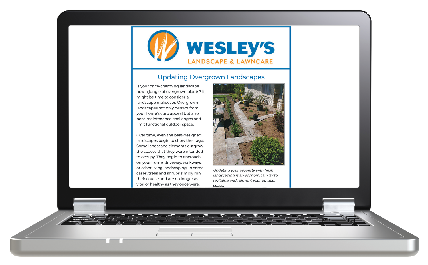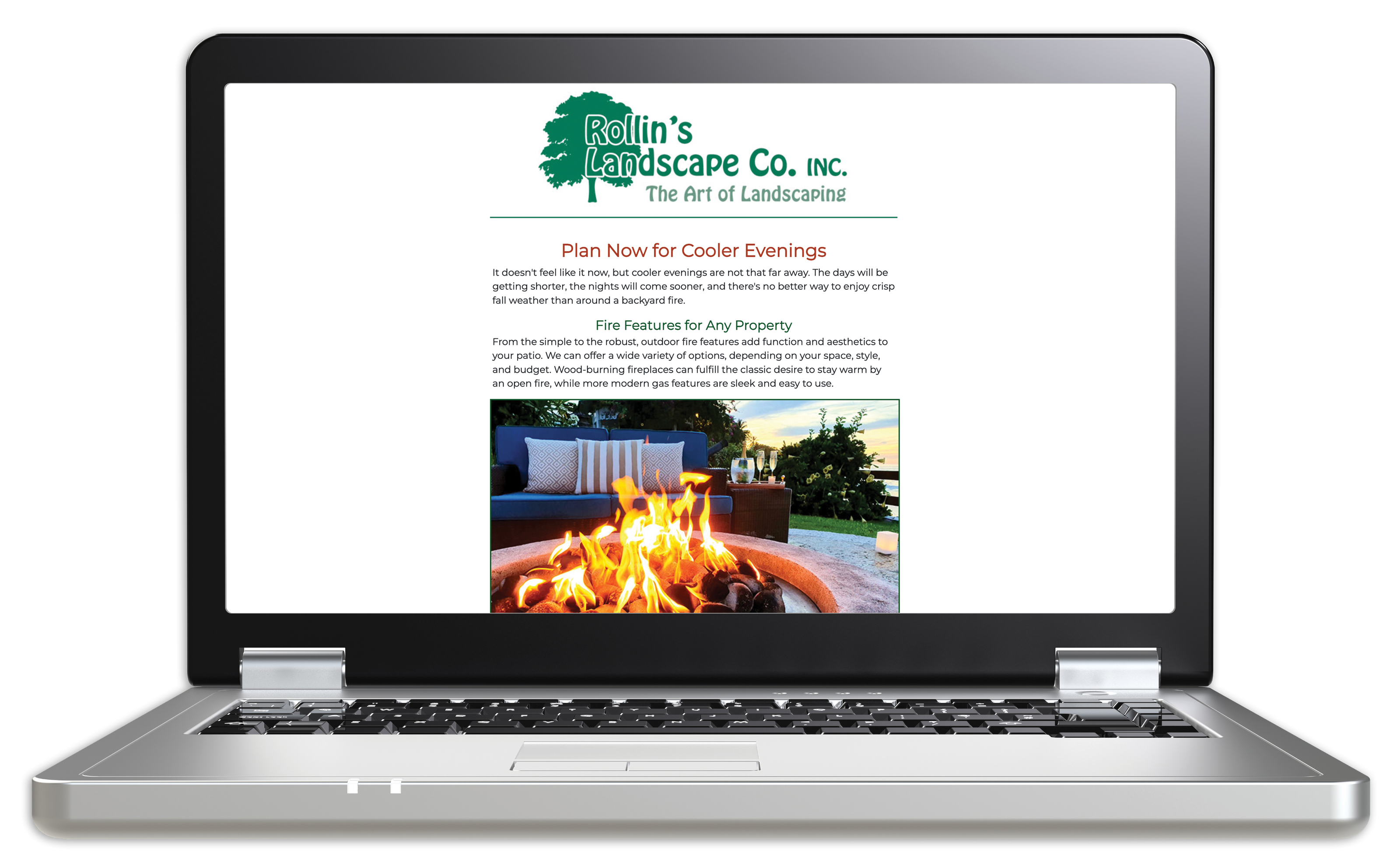 This is probably what you picture when you think of an "e-newsletter." We work with you to create a monthly calendar of informative e-mail newsletters. We pull from our archive of 1,000+ pre-written lawn/landscape articles, and we solicit any information you want us to include. We pull photos from your website when we can, and work with you to create a customized newsletter that will keep your audience informed about pertinent seasonal topics.