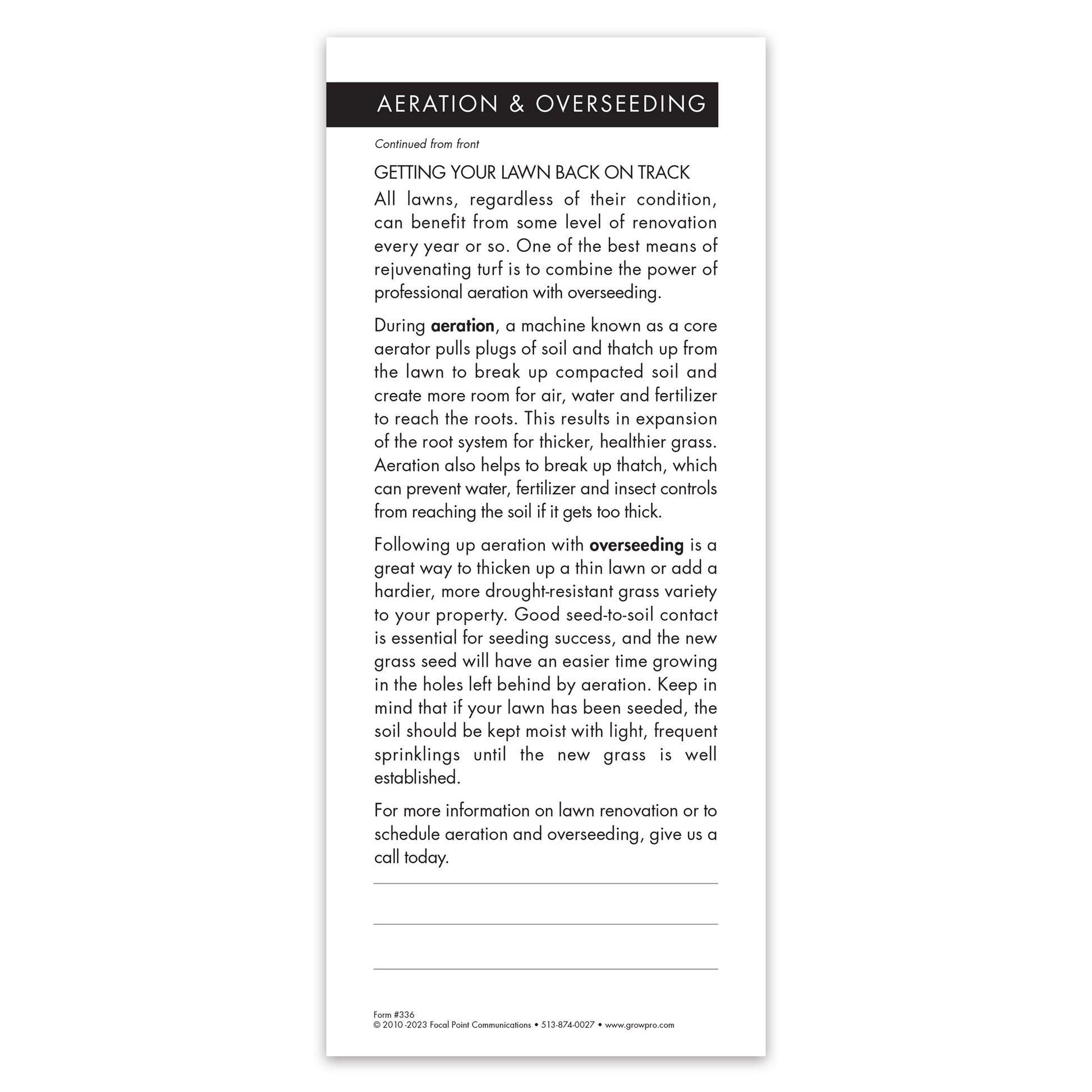 Aeration combined with overseeding is a popular service - and a profitable one! Let your customers know about this beneficial lawn renovation service with this Grow Note.