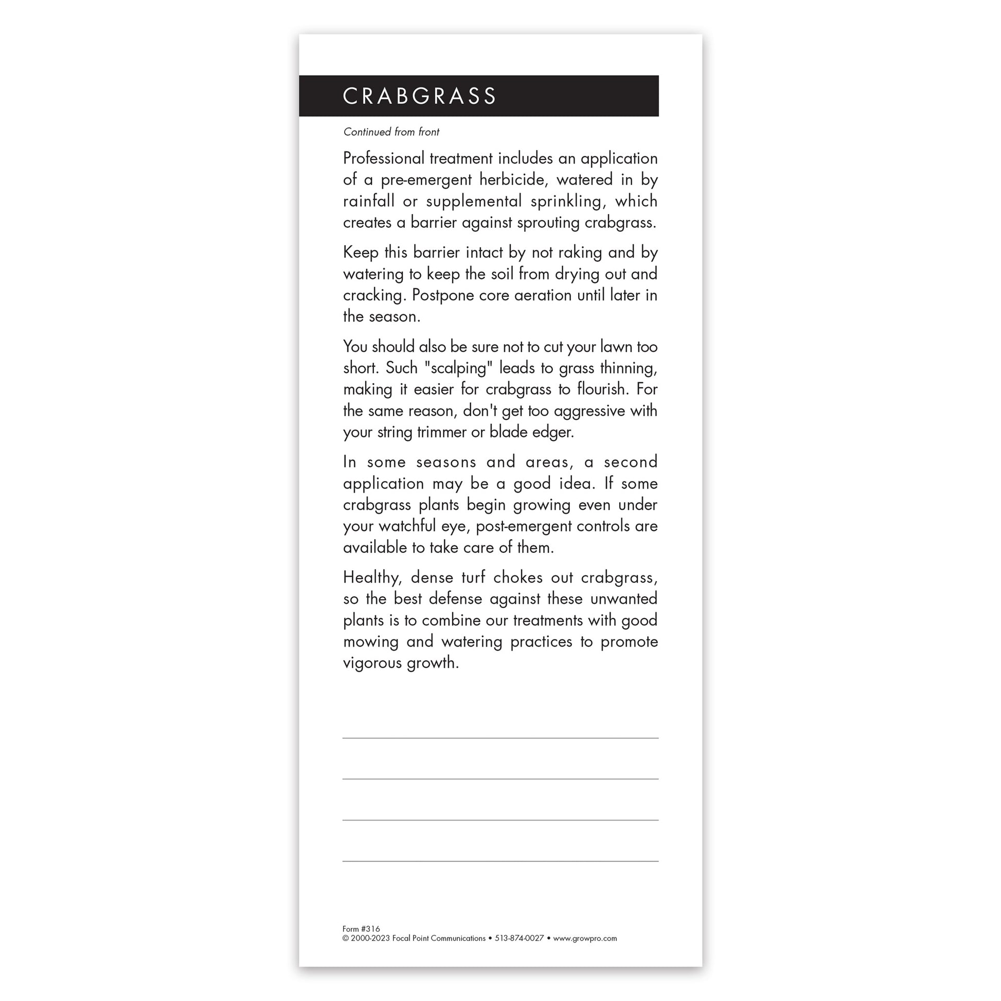 Let customers and prospects know that crabgrass seeds will always be present in their lawns, and your pre-emergent treatments can keep them from germinating. This Grow Note is perfect for promoting effective crabgrass control.