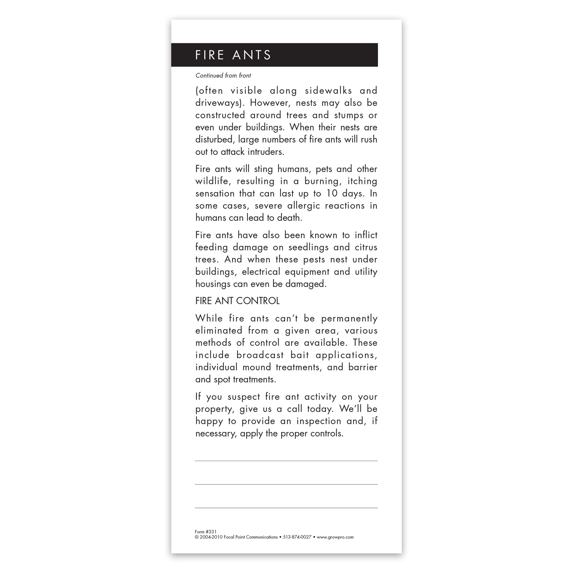 Are fire ants a problem in your area? If so, you can use this Grow Note to inform homeowners about the danger these pests pose while selling your fire ant control services at the same time.