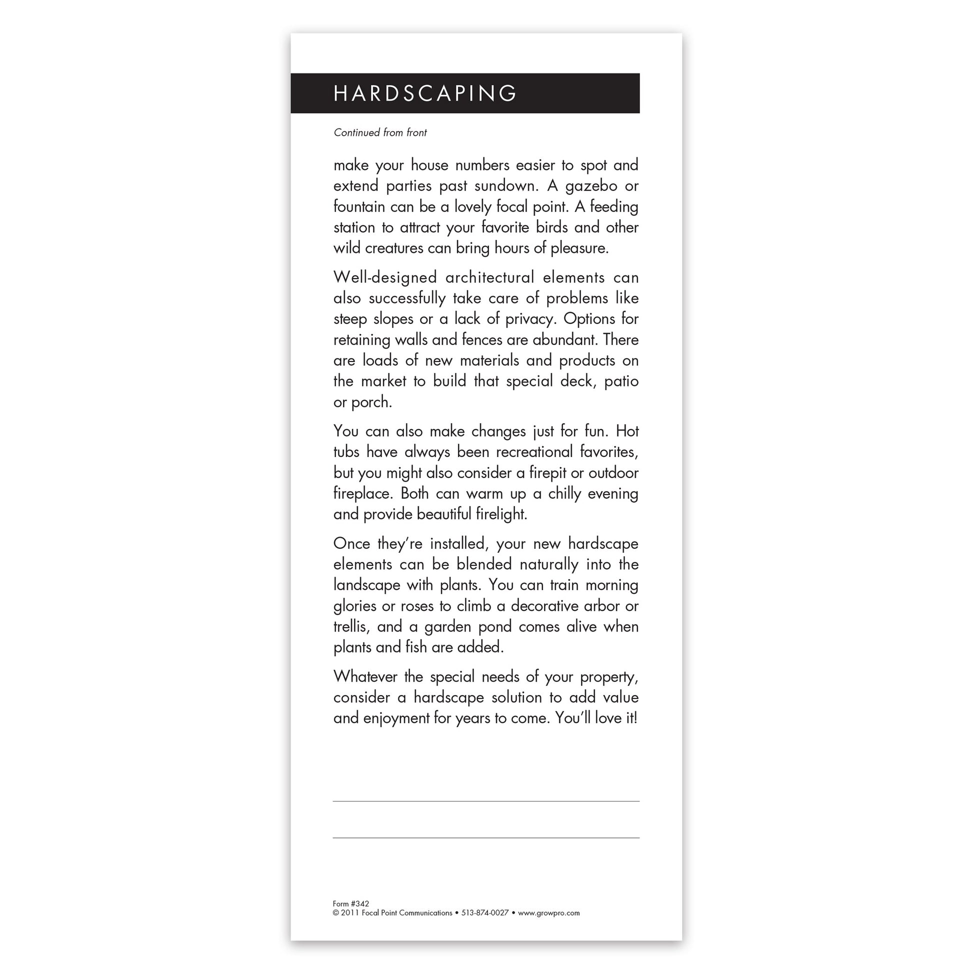 Help your clients to visualize the wide range of choices they have in improving their property with this Hardscape Grow Note. From retaining walls or patio pavers to firepits or fountains, hardscape additions are suggested as exciting landscape improvements to be considered.