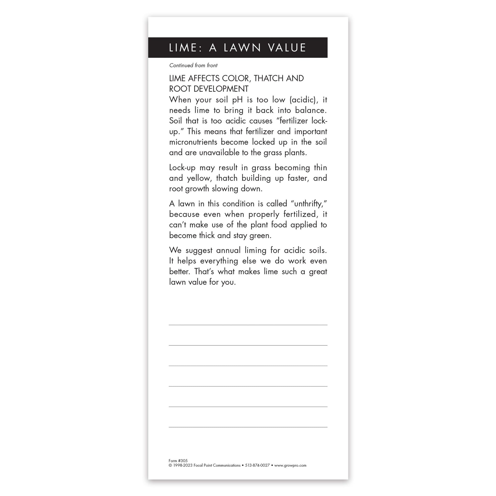 Your customers and prospects may not be aware of the role soil chemistry plays in lawn health. Use this Grow Note to show them how your liming service can encourage a thicker, greener lawn.
