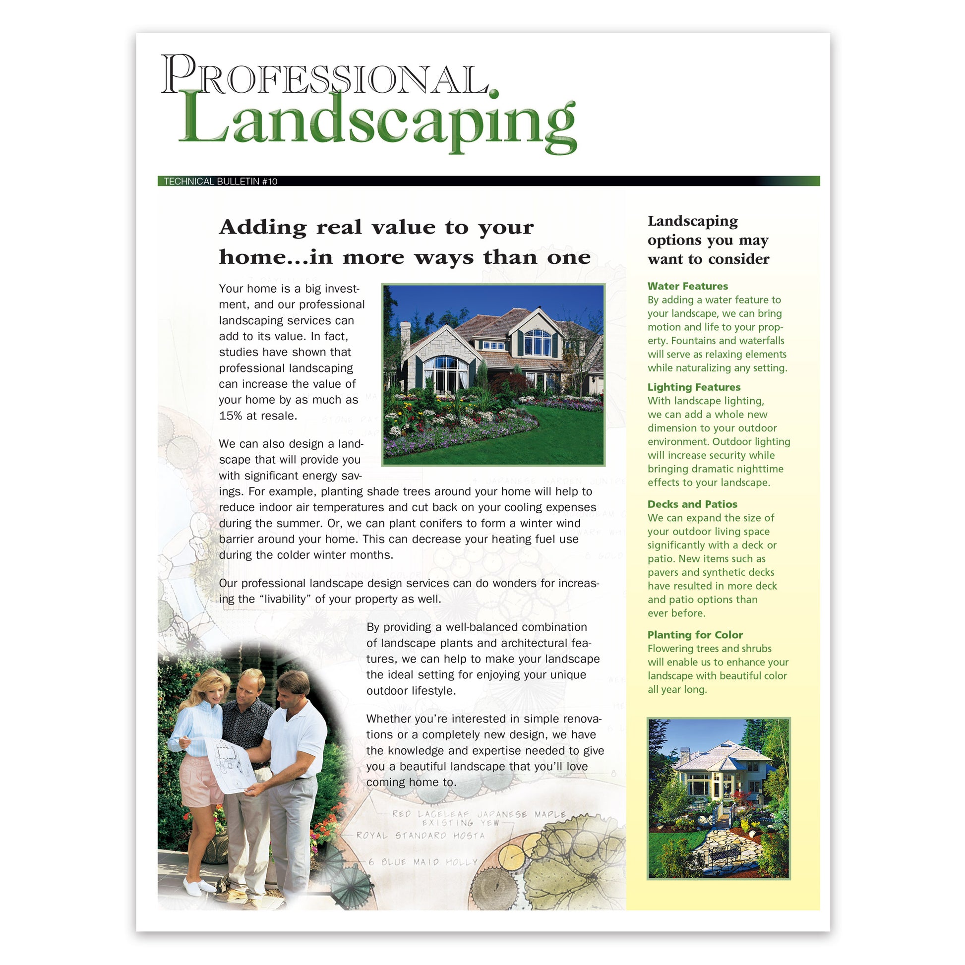 Show prospects what a difference your landscaping services can make in the looks and value of their homes. This bulletin explains the many benefits of professional landscaping, in addition to providing various ideas for property improvements.