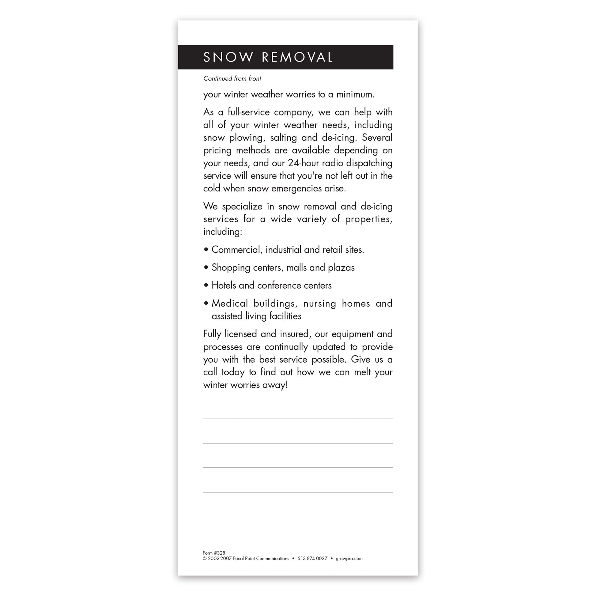 Let commercial customers and prospects know that when winter storms hit, you’ll be ready. This Grow Note is great for selling snow and ice removal services to a wide variety of property types.