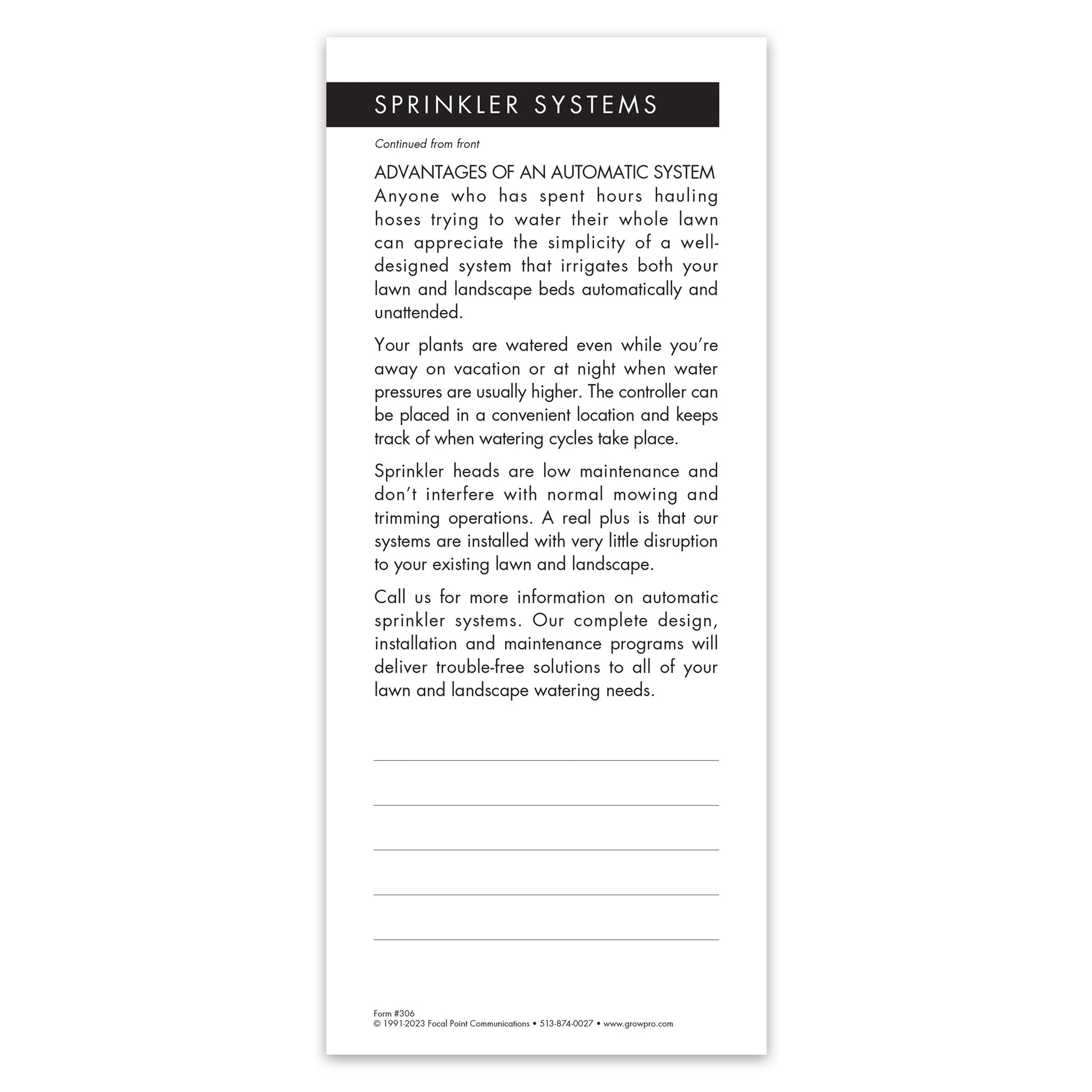 Show your customers and prospects that there’s an alternative to lugging hoses and sprinklers around! This Grow Note is perfect for promoting automatic irrigation system design, installation and maintenance.