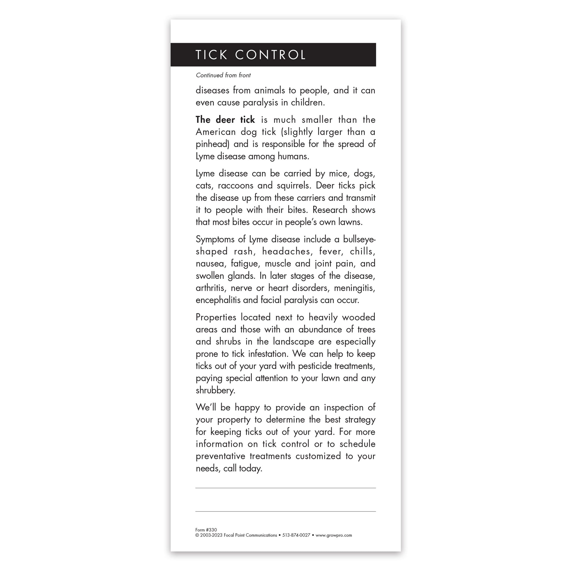 Educate your customers and prospects about the dangers posed by the American dog tick and deer tick. Use this Grow Note to show homeowners how you can protect their children and pets from these unwelcome pests.